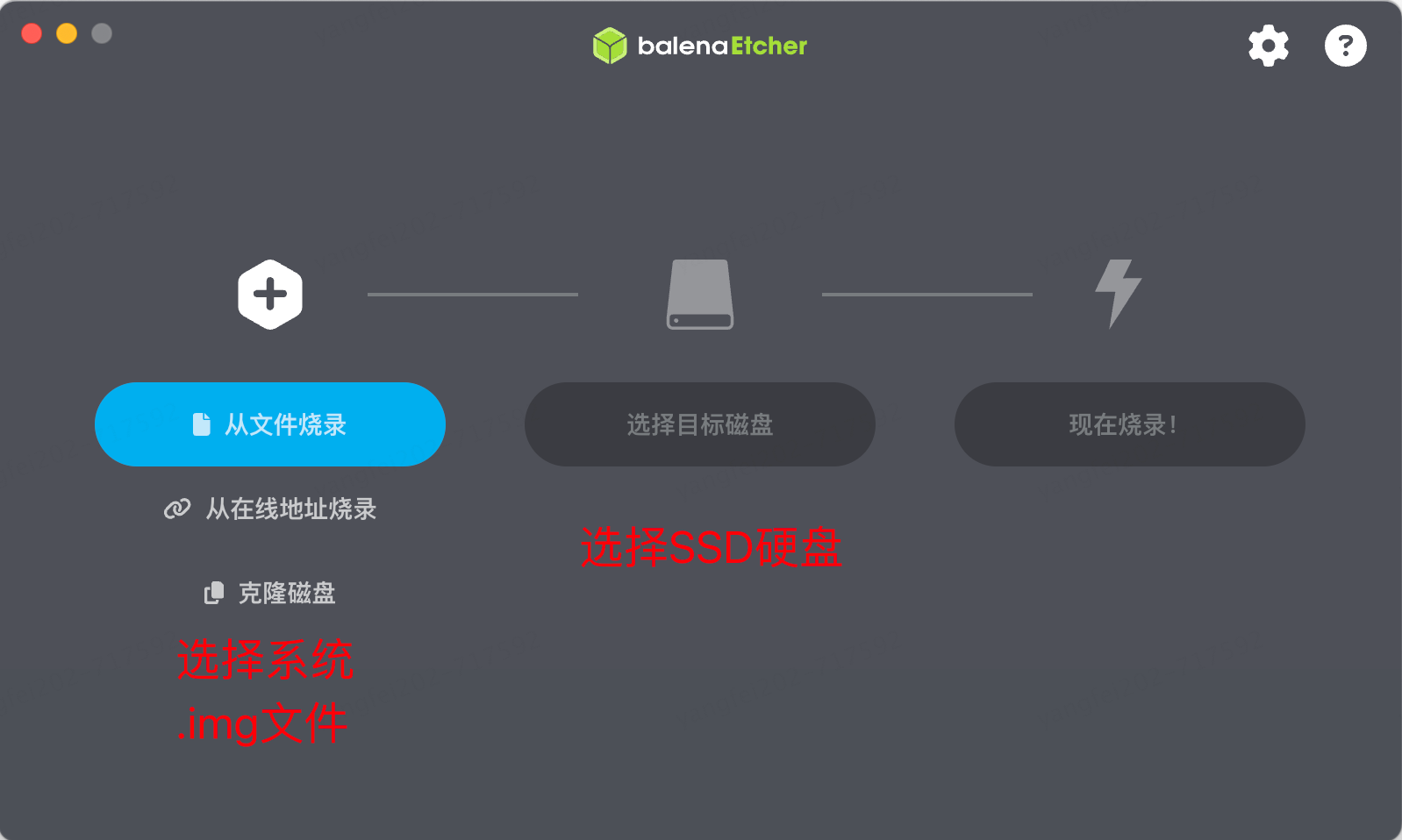 1.将系统烧录至 SSD 硬盘中(硬盘连接读卡器,接入到电脑),打开balenaEtcher烧录工具